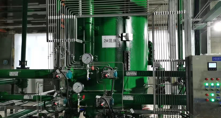 經(jīng)過反滲透裝置處理的水,仍不符合鍋爐的進(jìn)水水質(zhì)要求,其產(chǎn)水須再經(jīng)過混床作進(jìn)一步除鹽處理,因此增設(shè)混合離子交換器,進(jìn)一步提高系統(tǒng)產(chǎn)水水質(zhì),達(dá)到鍋爐補(bǔ)給水要求。
