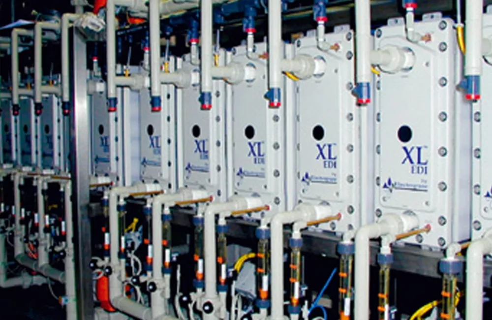 The use of ion-exchange resins in purification chambers and/or concentrated chambers is a key to CanPure's EDI technology and patents. Another important phenomenon that occurs in the purification chamber is that in specific regions with high potential gradients, electrochemical "decomposition" enables the water to produce large amounts of H+ and OH- ions. The H+ and OH- ions produced in these regions can regenerate the resin continuously in the mixed ion exchange resin and form thin films that do not require additional chemical agents.