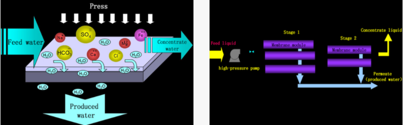 The pressed water enters the reverse osmosis pressure vessel, which is equipped with one or various reverse osmosis membrane elements. The permeated water after passing through the membrane is the produced water that has been desalted, and the other part of concentrated water is discharged from the vessel.